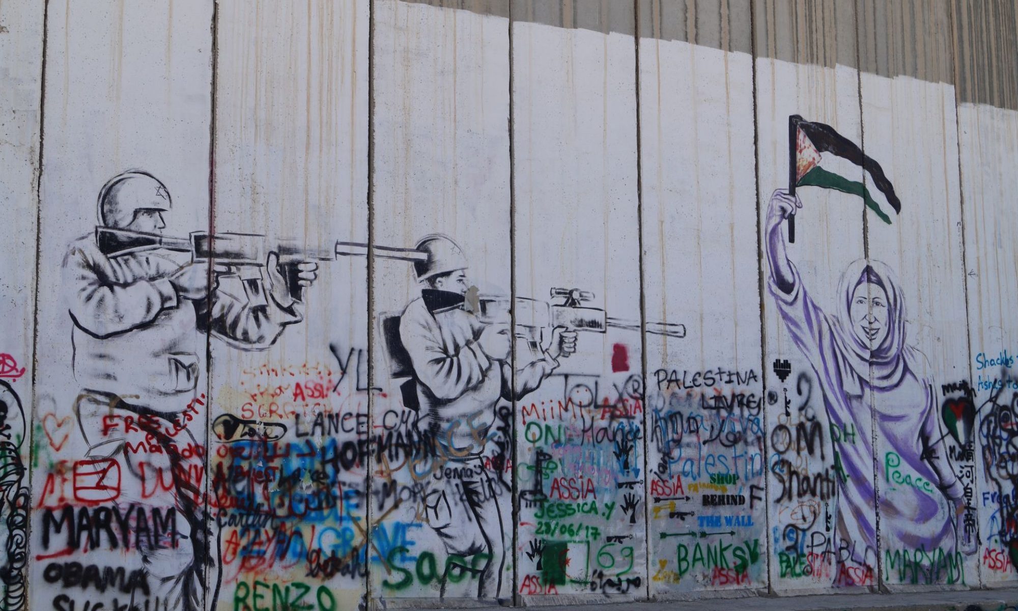 Eine 8 Meter hohe Mauer aus Stahlbeton umgibt die Stadt Bethlehem, ebenso wie viele weitere Städte des Westjordanlands. Ziel dieser israelischen Sperranlagen ist das Abfangen von Selbstmordattentätern aus den palästinensischen Gebieten. Auf israelischer Seite ist die Mauer schlichtweg grau, auf palästinensischer Seite wurde das unliebsame Bauwerk mit zahlreichen Graffiti besprüht. Viele davon ein Ausdruck von Kritik, Protest und Unzufriedenheit mit dem Vorgehen der israelischen Regierung.