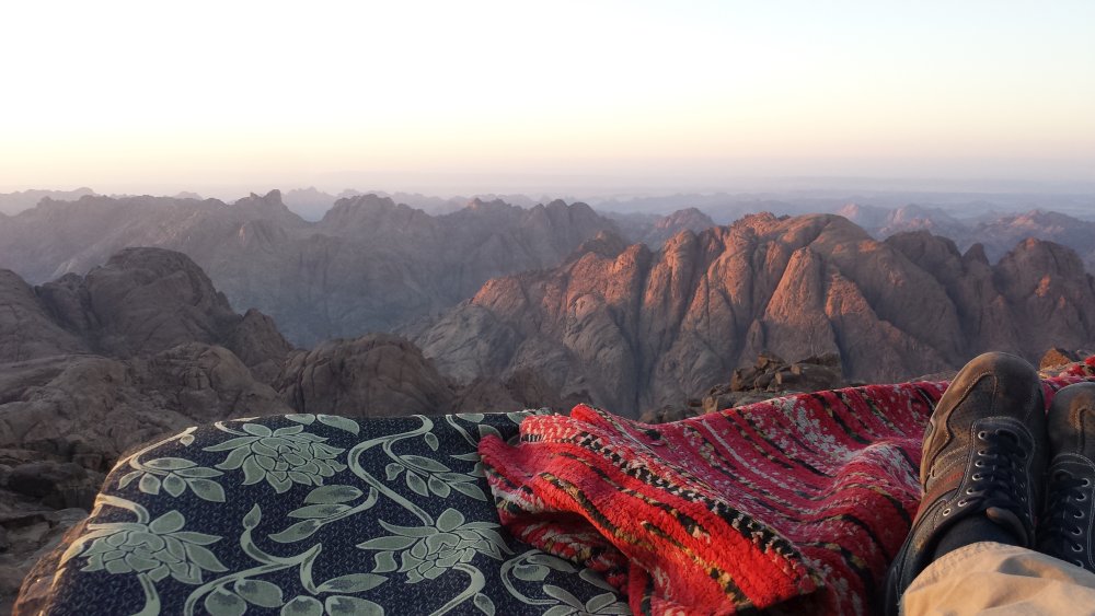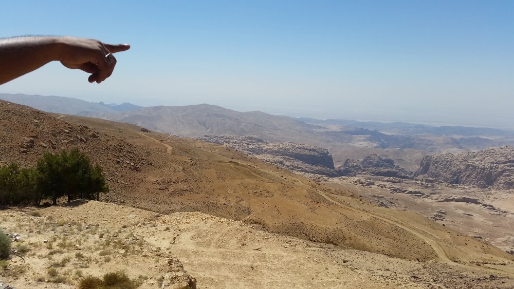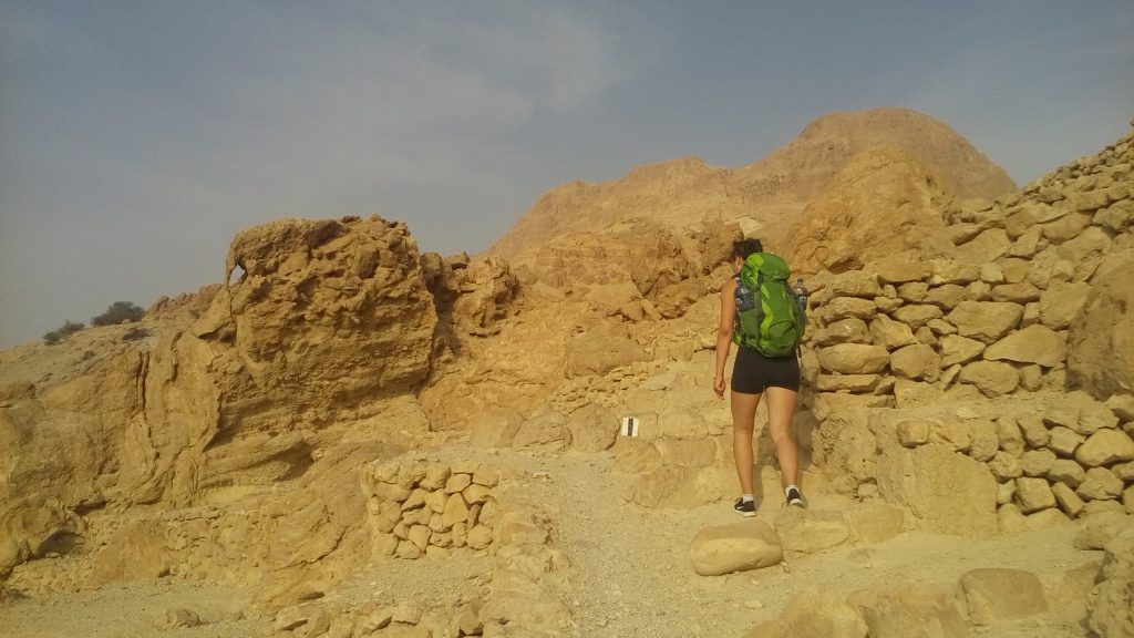 Obwohl es noch so früh war, ließ die Sonnenintensität bald jede Bewegung zu einer Anstrengung werden. Als Lea und ich fröhlich oben angekommen waren und bereits den überwältigenden, imposanten Blick über das Judäische Bergland genossen, schleppte sich Deneb mühevoll die letzten Wegbiegungen nach oben. Voller Begeisterung erkannten wir von hier oben den entfernt gelegenen Ölberg bei Jerusalem und nach Osten hin Dunstschwaden, welche das Tote Meer erahnen ließen. Von Denebs Stirn lief der Schweiß der Anstrengung in Strömen herab, doch in weiser Voraussicht hatte er ein lässig über seine Schulter hängendes Badehandtuch dabei, womit er sich alle paar Schritte über das Gesicht fuhr.