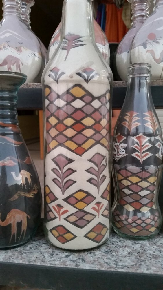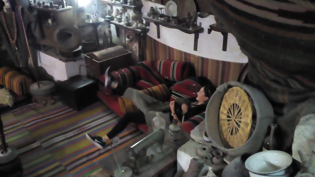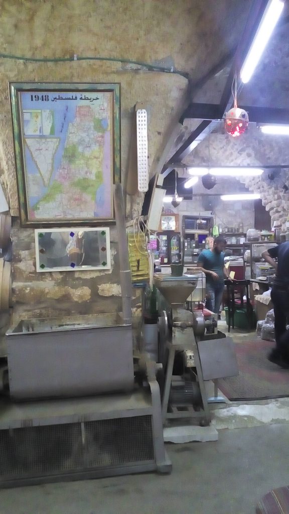 Nur wenige Meter weiter weiter wurden wir gleich von einem älteren Herrn mit langem grauen Bart und traditionellem Gewand und Turban in den hinteren Teil seines Ateliers gelotst, wo er uns eine kurze Führung durch sein privates Humus-Museum erteilte. Interessant zu sehen waren die Überreste eines riesigen Mahlsteines inmitten eines kleinen Raumes. Der Besitzer zeigte uns dann ein verschwommenes, welliges Foto, auf dem ein Kamel mit verbundenen Augen zu sehen war, das immer im Kreis lief, um den Mahlstein zu drehen. Die Augen, so erklärte und der nette Herr, würden den Tieren verbunden werden, damit ihnen nicht so schnell schwindelig würde.