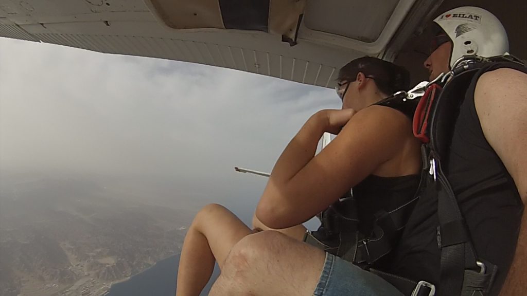 Unter uns war das tiefblaue Meer, kleine Bote waren auf dem Wasser gut erkennbar. Wir sahen die Hotels in Elat und ließen unsere Blicke über alle Grenzen hinweg nach Jordanien, den Sinai und bis nach Saudi Arabien schweifen. Das Land war die ganze Zeit klar und deutlich erkennbar, aber ein Gefühl für die Höhe hatte man hier oben nicht mehr. Ab und zu warfen unsere Tandempartner einen Blick auf die Höhenmesser an ihren Handgelenken. Nach einer gefühlten Ewigkeit hatten wir dann endlich die 3000er Marke erreicht.